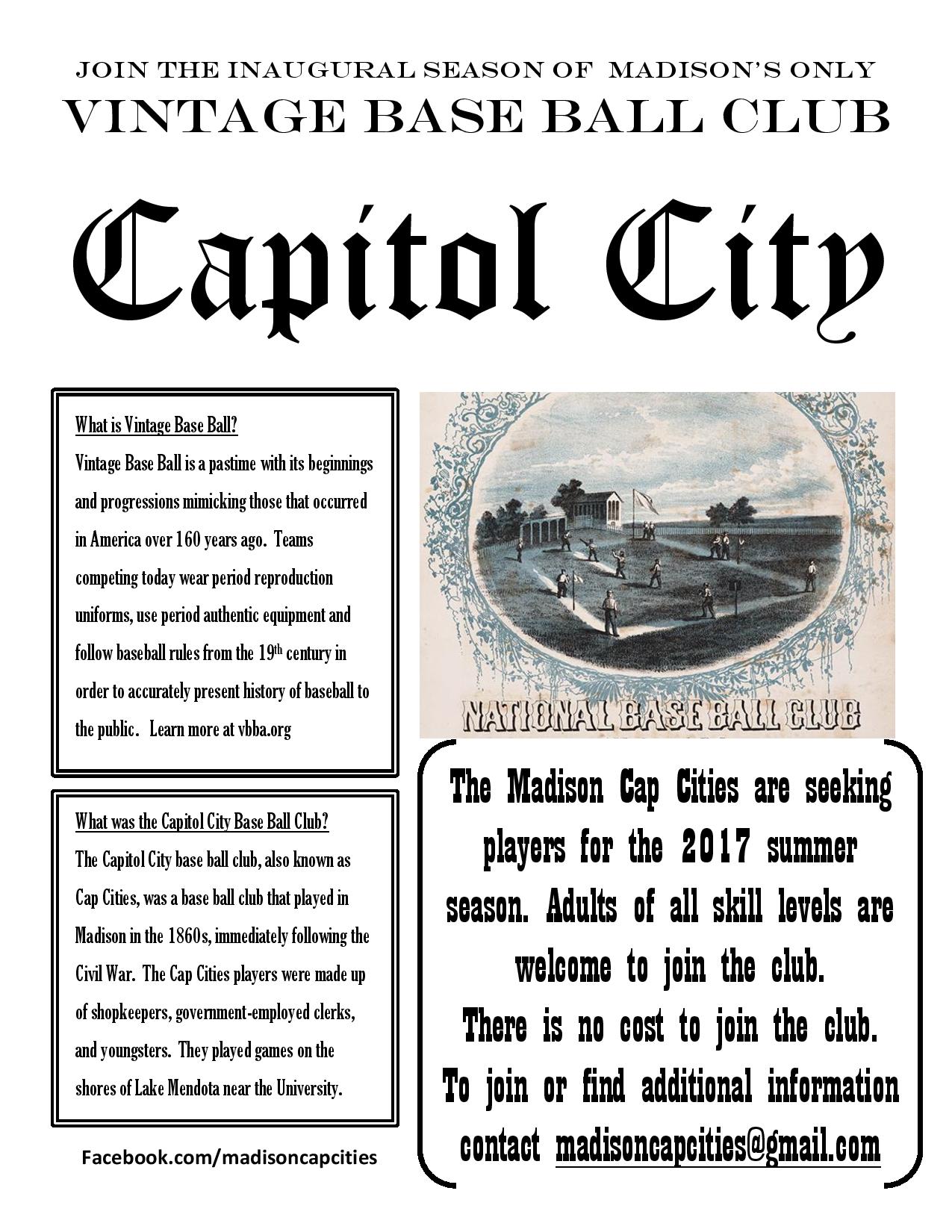 A vintage baseball club is starting up in Madison. It is called the Capitol City Base Ball Club, named after the baseball team that played here in the 1860s. The team will play other vintage baseball teams in the area. The club is currently recruiting players and Mike Gibson, the founder, invites you to consider joining. You can also share the facebook page, at facebook.com/madisoncapcities Thanks for your help! See flyer.
